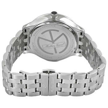 Stainless steel case with a stainless steel bracelet. Fixed stainless steel bezel. Black dial with silver-tone leaf-style hands and index hour markers. Roman numerals appear at the 3, 6, 9 and 12 o'clock positions. Dial Type: Analog. Date display below the 12 o'clock position. Small seconds sub-dial. Quartz movement. Scratch resistant sapphire crystal. Pull / push crown. Transparent case back. Round case shape. Case size: 42 mm. Case thickness: 7 mm. Band width: 22 mm. Butterfly clasp. Water resistant at 50 meters / 165 feet. Functions: date, hour, minute, second. Edmond Metal Series. Casual watch style. Watch label: Swiss Made. Mathey-Tissot Edmond Metal Black Dial Men's Watch H1886MAN.