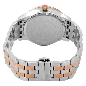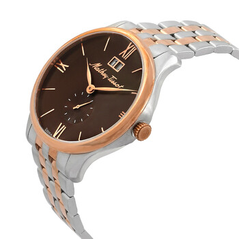 Stainless steel case with a two-tone (silver-tone and rose gold PVD) stainless steel bracelet. Fixed rose gold PVD bezel. Brown dial with rose gold-tone leaf-style hands and index hour markers. Roman numerals appear at the 3, 6, 9 and 12 o'clock positions. Dial Type: Analog. Date display below the 12 o'clock position. Small seconds sub-dial. Quartz movement. Scratch resistant sapphire crystal. Pull / push crown. Solid case back. Round case shape. Case size: 42 mm. Case thickness: 7 mm. Band width: 20 mm. Butterfly clasp. Water resistant at 50 meters / 165 feet. Functions: date, hour, minute, second. Edmond Metal Series. Casual watch style. Watch label: Swiss Made. Mathey-Tissot Edmond Metal Brown Dial Men's Watch H1886MRM.
