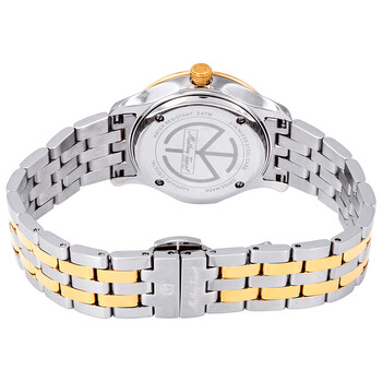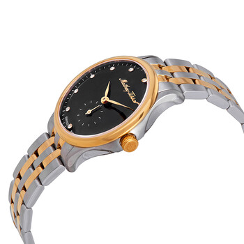 Stainless steel case with a two-tone (silver-tone and yellow gold-plated) stainless steel bracelet. Fixed yellow gold-plated bezel. Black dial with gold-tone leaf-style hands and crystal hour markers. Minute markers around the outer rim. Dial Type: Analog. Small seconds sub-dial. Quartz movement. Scratch resistant sapphire crystal. Pull / push crown. Solid case back. Round case shape. Case size: 32 mm. Case thickness: 5 mm. Band width: 16 mm. Butterfly clasp. Water resistant at 50 meters / 165 feet. Functions: hour, minute, second. Edmond Metal Series. Dress watch style. Watch label: Swiss Made. Mathey-Tissot Edmond Metal Crystal Black Dial Ladies Watch D1886MBN.