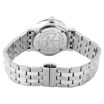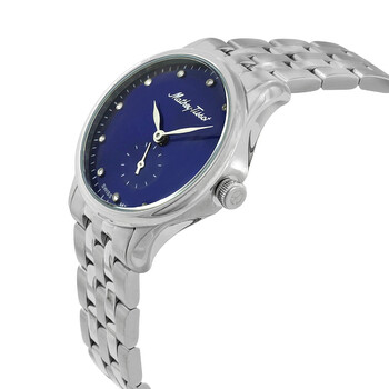 Stainless steel case with a stainless steel bracelet. Fixed stainless steel bezel. Blue dial with silver-tone leaf-style hands and crystal hour markers. Minute markers around the outer rim. Dial Type: Analog. Small seconds sub-dial. Quartz movement. Scratch resistant sapphire crystal. Pull / push crown. Solid case back. Round case shape. Case size: 32 mm. Case thickness: 5 mm. Butterfly clasp. Water resistant at 50 meters / 165 feet. Functions: hour, minute, second. Edmond Metal Series. Dress watch style. Watch label: Swiss Made. Mathey-Tissot Edmond Metal Crystal Blue Dial Ladies Watch D1886MABU.