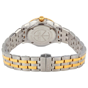 Stainless steel case with a two-tone (silver-tone and yellow gold PVD) stainless steel bracelet. Fixed yellow gold PVD bezel. White dial with yellow gold-tone leaf-style hands and crystal hour markers. Minute markers around the outer rim. Dial Type: Analog. Small seconds subdials. Quartz movement. Scratch resistant sapphire crystal. Pull / push crown. Solid case back. Round case shape. Case size: 32 mm. Case thickness: 5 mm. Band width: 18 mm. Butterfly clasp. Water resistant at 50 meters / 165 feet. Functions: hour, minute, second. Edmond Metal Series. Dress watch style. Watch label: Swiss Made. Mathey-Tissot Edmond Metal Crystal White Dial Ladies Watch D1886MBI.