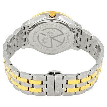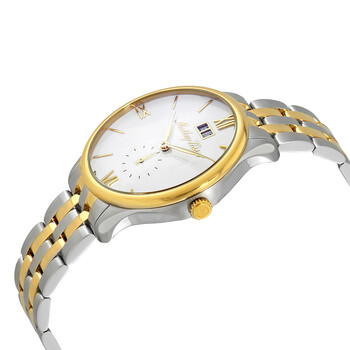 Stainless steel case with a two-tone (silver-tone and gold-tone) stainless steel bracelet. Fixed gold-tone bezel. White dial with gold-tone leaf-style hands and index hour markers. Roman numerals appear at the 3, 6, 9 and 12 o'clock positions. Dial Type: Analog. Date display below the 12 o'clock position. Small seconds sub-dial. Quartz movement. Scratch resistant sapphire crystal. Pull / push crown. Solid case back. Round case shape, case size: 42 mm, case thickness: 7 mm. Band width: 20 mm. Fold over clasp with a push button release. Water resistant at 50 meters / 165 feet. Functions: date, hour, minute, second. Edmond Metal Series. Casual watch style. Watch label: Swiss Made. Mathey-Tissot Edmond Metal White Dial Men's Watch H1886MBI.