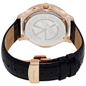 Rose gold PVD stainless steel case with a black leather strap. Fixed rose gold PVD bezel. Black dial with rose gold-tone hands and index hour markers. Roman numerals mark the 3, 6, 9 and 12 o'clock positions. Minute markers around the outer rim. Dial Type: Analog. Date display at the 3 o'clock position. Three sub-dials displaying: date, day of the week and month. Moonphase display. Ronda caliber 706.3 quartz movement. Scratch resistant sapphire crystal. Pull / push crown. Solid case back. Round case shape. Case size: 42 mm. Case thickness: 11 mm. Band width: 20 mm. Deployment clasp. Water resistant at 50 meters / 165 feet. Functions: date, day, month, hour, minute, second, moonphase. Edmond Moon Series. Dress watch style. Watch label: Swiss Made. Mathey-Tissot Edmond Moon Phase Black Dial Men's Watch H1886RPN.