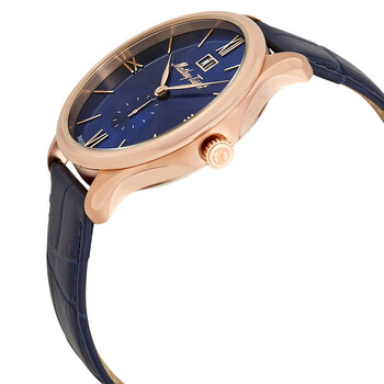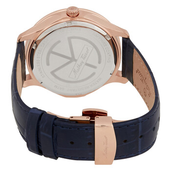 Rose gold PVD stainless steel case with a blue leather strap. Fixed rose gold PVD bezel. Blue dial with rose gold-tone hands and index hour markers. Roman numerals mark the 3, 6, 9 and 12 o'clock positions. Dial Type: Analog. Date display below the 12 o'clock position. Small seconds sub-dial. Ronda caliber 505 H6 quartz movement. Scratch resistant sapphire crystal. Pull / push crown. Solid case back. Round case shape. Case size: 42 mm. Case thickness: 5 mm. Band width: 22 mm. Deployment clasp. Water resistant at 50 meters / 165 feet. Functions: big date, hour, minute, small second. Casual watch style. Watch label: Swiss Made. Mathey-Tissot Edmond Quartz Blue Dial Men's Watch H1886QPBU.