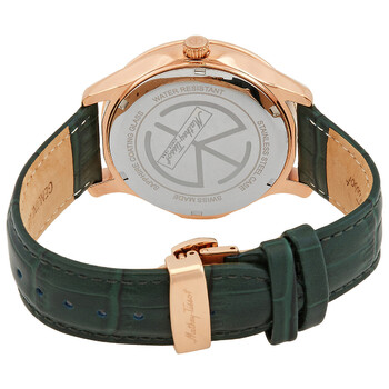 Rose gold-tone stainless steel case with a green genuine leather strap. Fixed rose gold-tone stainless steel bezel. Green dial with rose gold-tone hands and Roman numeral & index hour markers. Dial Type: Analog. Date display at the 12 o'clock position. One subdial displaying: small second. Ronda Caliber 505 H6 quartz movement. Scratch resistant mineral crystal. Pull / push crown. Solid case back. Round case shape, case size: 42 mm. Water resistant at 50 meters / 165 feet. Functions: big date, hour, minute, small second. Edmond Series. Casual watch style. Watch label: Swiss Made. Mathey-Tissot Edmond Quartz Green Dial Men's Watch H1886QPV.