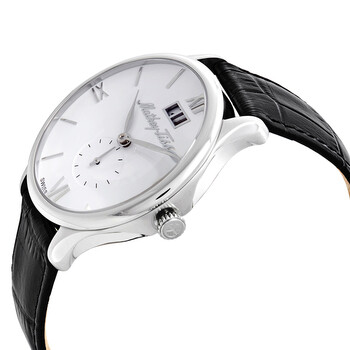 Stainless steel case with a black leather strap. Fixed stainless steel bezel. White dial with silver-tone leaf-style hands and index hour markers. Roman numerals mark the 3, 6,9 and 12 o'clock positions. Dial Type: Analog. Date display below the 12 o'clock position. Small seconds sub-dial. Ronda caliber 505 H6 quartz movement. Scratch resistant sapphire crystal. Pull / push crown. Solid case back. Round case shape. Case size: 42 mm. Case thickness: 5 mm. Band width: 20 mm. Deployment clasp. Water resistant at 50 meters / 165 feet. Functions: date, hour, minute, second. Edmond Quartz Series. Casual watch style. Watch label: Swiss Made. Mathey-Tissot Edmond Quartz White Dial Men's Watch H1886QAI.
