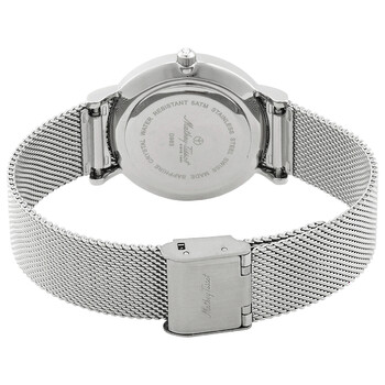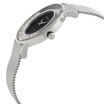 Silver-tone stainless steel case with a silver-tone stainless steel mesh bracelet. Fixed silver-tone stainless steel bezel. Black dial with silver-tone hands and diamond hour markers. Dial Type: Analog. Ronda Caliber 762 quartz movement. Scratch resistant sapphire crystal. Pull / push crown. Solid case back. Round case shape, case size: 32 mm, case thickness: 6 mm. Water resistant at 50 meters / 165 feet. Functions: hour, minute. Electra Series. Dress watch style. Watch label: Swiss Made. Mathey-Tissot Electra Quartz Diamond Black Dial Ladies Watch D983SAN.