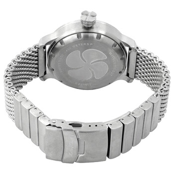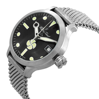Stainless steel case with a stainless steel mesh bracelet. Fixed stainless steel bezel. Black dial with luminous silver-tone hands and dot hour markers. Minute markers around the outer rim. Dial Type: Analog. Luminescent hands and markers. Date display at the 3 o'clock position. Sellita caliber SW200 automatic movement, containing 26 Jewels, bitting at 28800 vph, and has a power reserve of approximately 38 hours. Scratch resistant sapphire crystal. Screw down crown. Solid case back. Round case shape. Case size: 43.5 mm. Case thickness: 14 mm. Deployment clasp with a push button release Water resistant at 40 meters / 120 feet. Functions: date, hour, minute, second. Additional Info: 40atm. Elica Series. Dive watch style. Watch label: Swiss Made. Mathey-Tissot Elica Automatic Black Dial Men's Watch U-121AN.