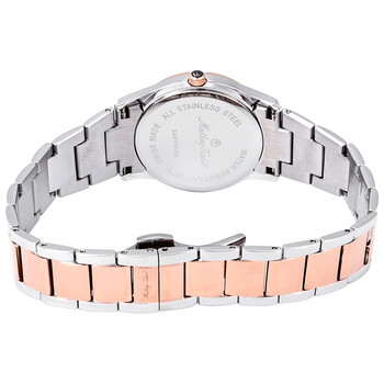 Stainless steel case with a two-tone (silver-tone and rose gold PVD) stainless steel bracelet. Fixed rose gold PVD bezel. White mother of pearl dial with rose gold-tone hands and dot hour markers. Dial Type: Analog. Date display at the 6 o'clock position. Ronda caliber 515 quartz movement. Scratch resistant sapphire crystal. Pull / push crown. Solid case back. Round case shape. Case size: 30 mm. Case thickness: 8 mm. Band width: 17 mm. Butterfly clasp. Water resistant at 50 meters / 165 feet. Functions: date, hour, minute, second. Elisa Series. Dress watch style. Watch label: Swiss Made. Mathey-Tissot Elisa White Mother of Pearl Dial Ladies Watch D2111BI.