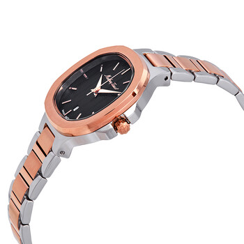 Stainless steel case with a two-tone (silver-tone and rose gold-plated) stainless steel bracelet. Fixed rose gold-plated bezel. Black dial with luminous rose gold-tone dauphine-style hands and index hour markers. Dial Type: Analog. Luminescent hands. Date display at the 6 o'clock position. Ronda caliber 585 quartz movement. Scratch resistant sapphire coated glass crystal. Push crown. Solid case back. Pillow case shape. Case size: 32 mm. Case thickness: 8 mm. Band width: 16 mm. Butterfly clasp. Water resistant at 50 meters / 165 feet. Functions: date, hour, minute, second. Evasion Series. Casual watch style. Watch label: Swiss Made. Mathey-Tissot Evasion Black Dial Ladies Watch D152RN.