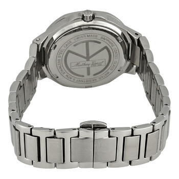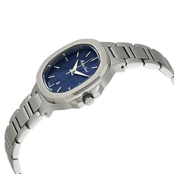 Stainless steel case with a stainless steel bracelet. Fixed stainless steel bezel. Blue dial with luminous silver-tone hands and index hour markers. Dial Type: Analog. Luminescent hands. Date display at the 5 o'clock position. Ronda caliber 585 quartz movement. Scratch resistant sapphire glass crystal. Pull / push crown. Solid case back. Cushion case shape. Case size: 32 mm. Case thickness: 8 mm. Band width: 16 mm. Push button clasp. Water resistant at 50 meters / 165 feet. Functions: date, hour, minute, second. Casual watch style. Watch label: Swiss Made. Mathey-Tissot Evasion Blue Dial Stainless Steel Ladies Watch D152ABU.