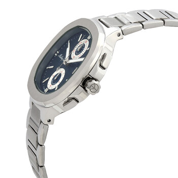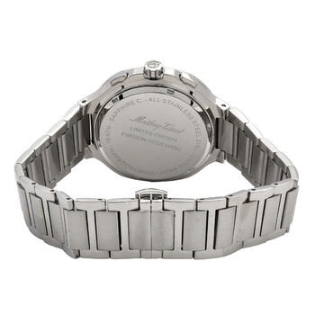 Silver-tone stainless steel case and bracelet. Fixed silver-tone stainless steel bezel. Blue dial with silver-tone hands and index hour markers. Minute markers around the outer rim. Dial Type: Analog. Luminescent hands and markers. Date display at the 3 o'clock position. Chronograph - two sub-dials displaying: 60 second and 30 minute. Ronda Caliber 3520.D quartz movement. Scratch resistant mineral crystal. Pull / push crown. Solid case back. Square case shape, case size: 42 mm. Fold over clasp with a safety release. Water resistant at 100 meters / 330 feet. Functions: chronograph, date, hour, minute, small second. Evasion Series. Casual watch style. Watch label: Swiss Made. Mathey-Tissot Evasion Chronograph Quartz Blue Dial Men's Watch H152CHABU.