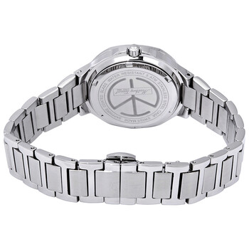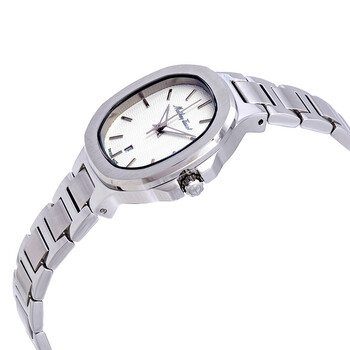 Stainless steel case with a stainless steel bracelet. Fixed stainless steel bezel. Silver dial with luminous silver-tone hands and index hour markers. Dial Type: Analog. Luminescent hands. Date display above the 6 o'clock position. Quartz movement. Scratch resistant sapphire coated crystal. Pull / push crown. Solid case back. Pillow case shape. Case size: 32 mm. Case thickness: 8 mm. Band width: 16 mm. Butterfly clasp. Water resistant at 50 meters / 165 feet. Functions: date, hour, minute, second. Evasion Series. Casual watch style. Watch label: Swiss Made. Mathey-Tissot Evasion Silver Dial Ladies Watch D152AI.