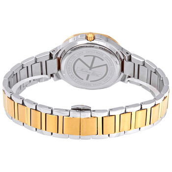 Stainless steel case with a two-tone (silver-tone and yellow gold-plated) stainless steel bracelet. Fixed yellow gold-plated bezel. White dial with luminous yellow gold-tone hands and index hour markers. Dial Type: Analog. Luminescent hands. Date display above the 6 o'clock position. Ronda caliber 585 quartz movement. Scratch resistant sapphire crystal. Pull / push crown. Solid case back. Cushion case shape. Case size: 32 mm. Case thickness: 8 mm. Band width: 16 mm. Butterfly clasp. Water resistant at 50 meters / 165 feet. Functions: date, hour, minute, second. Evasion Series. Casual watch style. Watch label: Swiss Movt. Mathey-Tissot Evasion White Dial Ladies Watch D152BI.