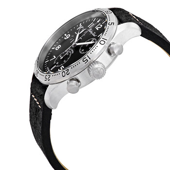 Stainless steel case with a black leather strap. Fixed stainless steel bezel. Black dial with luminous silver-tone hands and Arabic numeral hour markers. Minute markers around the outer rim. Dial Type: Analog. Luminescent hands. Date display at the 6 o'clock position. Chronograph - three sub-dials displaying: 60 second, 60 minute and 12 hour. ETA caliber G10 212 AN quartz movement. Scratch resistant sapphire crystal. Pull / push crown. Solid case back. Round case shape. Case size: 42 mm. Case thickness: 11 mm. Band width: 22 mm. Deployment clasp. Water resistant at 50 meters / 165 feet. Functions: chronograph, flyback, date, hour, minute, second. Flyback Type 21 Series. Sport watch style. Watch label: Swiss Made. Mathey-Tissot Flyback Type 21 Chronograph Black Dial Men's Watch H1821CHALNG.