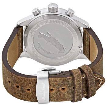 Stainless steel case with a brown leather strap. Fixed stainless steel bezel. Black dial with luminous silver-tone hands and Arabic numeral hour markers. Minute markers around the outer rim. Dial Type: Analog. Luminescent hands. Date display at the 6 o'clock position. Chronograph - three sub-dials displaying: 60 second, 60 minute and 12 hour. ETA caliber G10 212 AN quartz movement. Scratch resistant sapphire crystal. Pull / push crown. Solid case back. Round case shape. Case size: 42 mm. Case thickness: 11 mm. Band width: 20 mm. Fold over clasp with a push button release. Water resistant at 50 meters / 165 feet. Functions: chronograph, flyback, date, hour, minute, second. Flyback Type 21 Series. Sport watch style. Watch label: Swiss Made. Mathey-Tissot Flyback Type 21 Chronograph Black Dial Men's Watch H1821CHALNO.