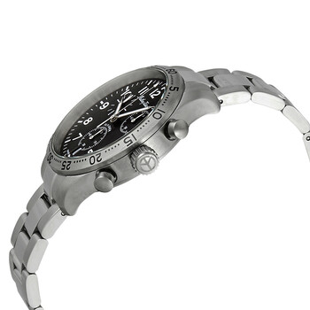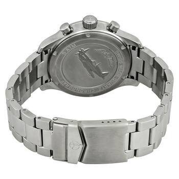 Stainless steel case with a stainless steel bracelet. Fixed stainless steel bezel. Black dial with luminous silver-tone hands and Arabic numeral hour markers. Minute markers around the outer rim. Dial Type: Analog. Luminescent hands. Date display at the 6 o'clock position. Chronograph - three sub-dials displaying: 60 second, 60 minute and 12 hour. ETA caliber G10 212 AN quartz movement. Scratch resistant sapphire crystal. Pull / push crown. Solid case back. Round case shape. Case size: 42 mm. Case thickness: 11 mm. Band width: 20 mm. Fold over clasp with a safety release. Water resistant at 50 meters / 165 feet. Functions: chronograph, flyback, date, hour, minute, second. Flyback Type 21 Series. Sport watch style. Watch label: Swiss Made. Mathey-Tissot Flyback Type 21 Chronograph Black Dial Men's Watch H1821CHANG.