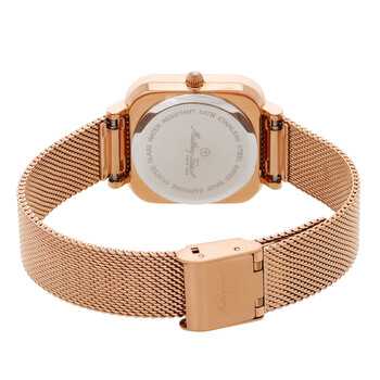 Rose gold-tone stainless steel case and bracelet. Fixed rose gold-tone stainless steel bezel. Black dial with rose gold-tone hands and diamond hour markers. Dial Type: Analog. Ronda Caliber 762 quartz movement. Scratch resistant mineral crystal. Pull / push crown. Solid case back. Square case shape, case size: 28 mm. Fold over clasp with a safety release. Water resistant at 50 meters / 165 feet. Functions: hour, minute. Gemina Series. Dress watch style. Watch label: Swiss Made. Mathey-Tissot Gemina Quartz Diamond Black Dial Ladies Watch D984SPN.
