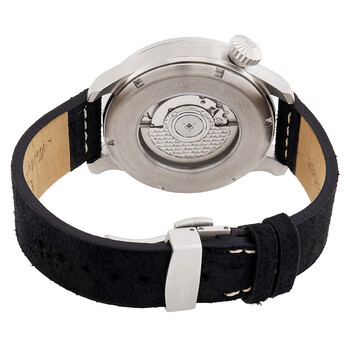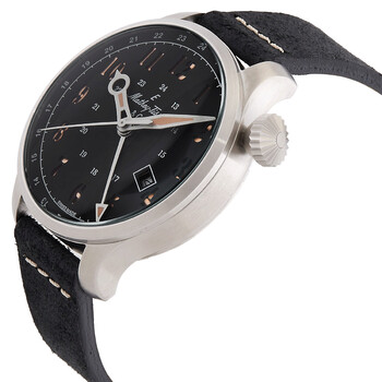 Silver-tone stainless steel case with a black leather strap. Fixed silver-tone stainless steel bezel. Black dial with silver-tone hands and Arabic numeral hour markers. Dial Type: Analog. Date display at the 4 o'clock position. ETA Caliber 293 automatic movement. Scratch resistant sapphire crystal. Round case shape, case size: 44 mm. Water resistant at 50 meters / 165 feet. Functions: GMT, second time zone, date, hour, minute, second. Gmt 293 Series. Watch label: Swiss Made. Mathey-Tissot GMT 293 Automatic Black Dial Men's Watch H123ABU.