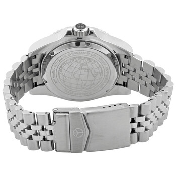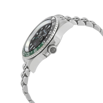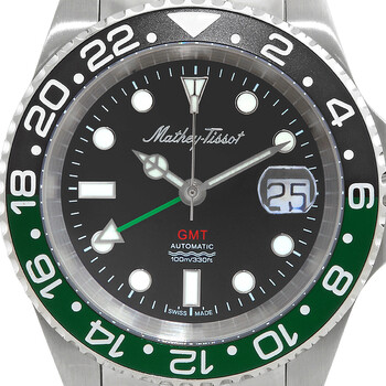 316L steel case with a 316L steel bracelet. Uni-directional rotating 316L steel bezel with a black and green ring showing 24 hour (GMT) markings. Black dial with luminous silver-tone hands and dot hour markers. Minute markers around the outer rim. Dial Type: Analog. Luminescent hands and markers. Date display at the 3 o'clock position. P293 automatic movement. Scratch resistant sapphire crystal. Screw down crown. Solid case back. Round case shape. Case size: 42 mm. Case thickness: 8.55 mm. Fold over clasp with a push button release. Water resistant at 100 meters / 330 feet. Functions: date,GMT, second time zone, hour, minute, second. Casual watch style. Watch label: Swiss Made. Mathey-Tissot GMT Automatic Black Dial Men's Watch H903ATNV.