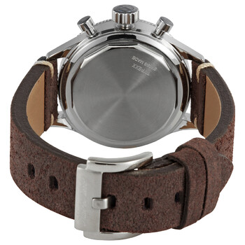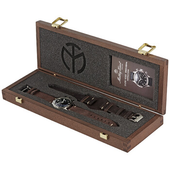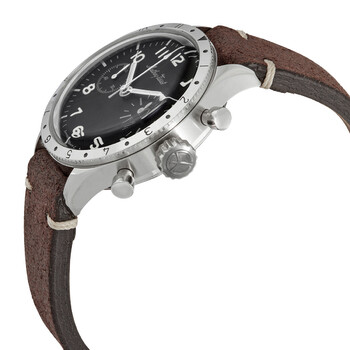 Stainless steel case with a brown leather strap. Bi-directional rotating stainless steel bezel. Black dial with luminous silver-tone hands and Arabic numeral hour markers. Minute markers around the outer rim. Dial Type: Analog. Luminescent hands and markers. Chronograph - two sub-dials displaying: 60 second and 30 minute. Sellita SW510BHa hand wind movement. Scratch resistant sapphire crystal. Pull / push crown. Solid case back. Round case shape. Case size: 38 mm. Case thickness: 14.6 mm. Tang clasp. Functions: chronograph, hour, minute, second. Homage Type Xx Series. Casual watch style. Watch label: Swiss Made. Mathey-Tissot Homage Type XX Black Dial Men's Watch TYPEXXIISE.