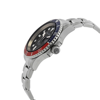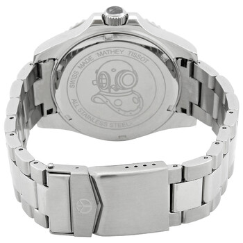 Stainless steel case with a stainless steel bracelet. Uni-directional rotating stainless steel bezel with an inlaid blue and red ceramic ring. Black dial with luminous silver-tone hands and dot hour markers. Minute markers around the outer rim. Dial Type: Analog. Luminescent hands and markers. Date display at the 3 o'clock position. Ronda caliber 515 quartz movement. Scratch resistant mineral crystal. Screw down crown. Solid case back. Round case shape. Case size: 43 mm. Fold over clasp. Water resistant at 200 meters / 660 feet. Functions: date, hour, minute, second. Jumbo Series. Casual watch style. Watch label: Swiss Made. Mathey-Tissot Jumbo Quartz Black Dial Men's Watch H9060AR.