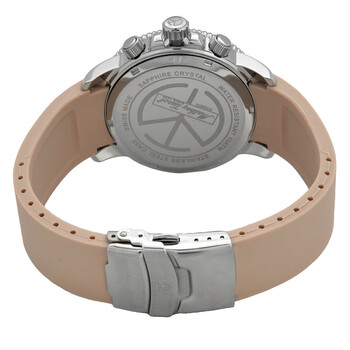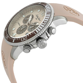 Silver-tone stainless steel case with a pink silicone strap. Uni-directional rotating brown bezel. Beige dial with silver-tone hands and Arabic numeral & index hour markers. Minute markers around the outer rim. Dial Type: Analog. Luminescent hands and markers. Date display at the 4 o'clock position. Chronograph - three sub-dials displaying: 60 second, 30 minute and 12 hour. Ronda Caliber 5030.D quartz movement. Scratch resistant mineral crystal. Screw down crown. Solid case back. Round case shape, case size: 42 mm. Band width: 22 mm. Fold over clasp. Water resistant at 100 meters / 330 feet. Functions: chronograph, date, hour, minute, small second. Lagoon Series. Casual watch style. Watch label: Swiss Made. Mathey-Tissot Lagoon Chronograph Beige Dial Unisex Watch H123CHLBM.
