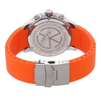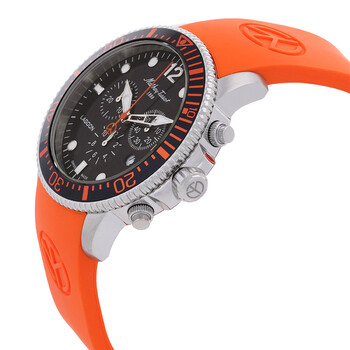 Silver-tone stainless steel case with a black silicone strap. Uni-directional rotating black bezel. Black dial with silver-tone hands and Arabic numeral & index hour markers. Minute markers around the outer rim. Dial Type: Analog. Luminescent hands and markers. Date display at the 4 o'clock position. Chronograph - three sub-dials displaying: 60 second, 30 minute and 12 hour. Ronda Caliber 5030.D quartz movement. Scratch resistant mineral crystal. Screw down crown. Solid case back. Round case shape, case size: 42.5 mm. Band width: 22 mm. Fold over clasp. Water resistant at 100 meters / 330 feet. Functions: chronograph, date, hour, minute, small second. Lagoon Series. Casual watch style. Watch label: Swiss Made. Mathey-Tissot Lagoon Chronograph Quartz Black Dial Men's Watch H123CHALO.