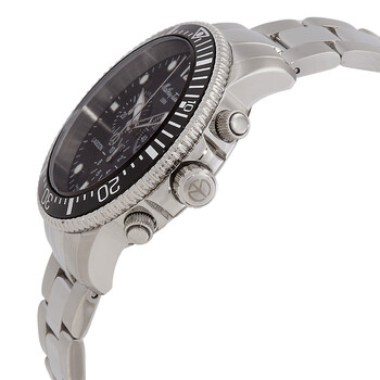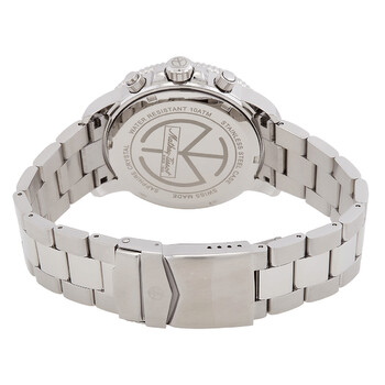 Silver-tone stainless steel case and bracelet. Uni-directional rotating black bezel. Black dial with silver-tone hands and Arabic numeral & index hour markers. Minute markers around the outer rim. Dial Type: Analog. Luminescent hands and markers. Date display at the 4 o'clock position. Chronograph - three sub-dials displaying: 60 second, 30 minute and 12 hour. Ronda Caliber 5030.D quartz movement. Scratch resistant mineral crystal. Screw down crown. Solid case back. Round case shape, case size: 42.5 mm. Band width: 22 mm. Fold over clasp. Water resistant at 100 meters / 330 feet. Functions: chronograph, date, hour, minute, small second. Lagoon Series. Casual watch style. Watch label: Swiss Made. Mathey-Tissot Lagoon Chronograph Quartz Black Dial Men's Watch H123CHAN.