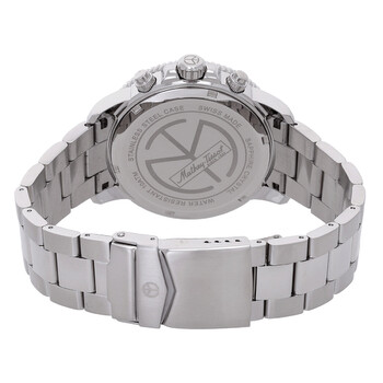 Silver-tone stainless steel case and bracelet. Uni-directional rotating black bezel. Blue dial with silver-tone hands and Arabic numeral & index hour markers. Minute markers around the outer rim. Dial Type: Analog. Luminescent hands and markers. Date display at the 4 o'clock position. Chronograph - three sub-dials displaying: 60 second, 30 minute and 12 hour. Ronda Caliber 5030.D quartz movement. Scratch resistant mineral crystal. Screw down crown. Solid case back. Round case shape, case size: 42.5 mm. Band width: 22 mm. Fold over clasp. Water resistant at 100 meters / 330 feet. Functions: chronograph, date, hour, minute, small second. Lagoon Series. Casual watch style. Watch label: Swiss Made. Mathey-Tissot Lagoon Chronograph Quartz Blue Dial Men's Watch H123CHABUN.