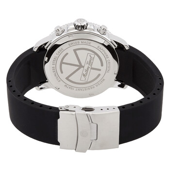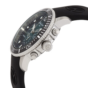 Silver-tone stainless steel case with a black silicone strap. Uni-directional rotating black bezel. Green dial with silver-tone hands and Arabic numeral & index hour markers. Minute markers around the outer rim. Dial Type: Analog. Luminescent hands and markers. Date display at the 4 o'clock position. Chronograph - three sub-dials displaying: 60 second, 30 minute and 12 hour. Ronda Caliber 5030.D quartz movement. Scratch resistant mineral crystal. Screw down crown. Solid case back. Round case shape, case size: 42.5 mm. Band width: 22 mm. Fold over clasp. Water resistant at 100 meters / 330 feet. Functions: chronograph, date, hour, minute, small second. Lagoon Series. Casual watch style. Watch label: Swiss Made. Mathey-Tissot Lagoon Chronograph Quartz Green Dial Men's Watch H123CHALV.