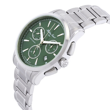 Silver-tone stainless steel case and bracelet. Fixed silver-tone stainless steel bezel. Green dial with silver-tone hands and index hour markers. Minute markers around the outer rim. Dial Type: Analog. Luminescent hands and markers. Date display at the 4 o'clock position. Three sub-dials displaying: day, 60 second and 30 minute. Ronda Caliber Z60 quartz movement. Scratch resistant mineral crystal. Pull / push crown. Solid case back. Round case shape, case size: 42 mm. Fold over clasp with a safety release. Functions: chronograph, date, day, hour, minute, small second. Lancelot Series. Casual watch style. Watch label: Swiss Made. Mathey-Tissot Lancelot Chronograph Quartz Green Dial Men's Watch H198CHAV.