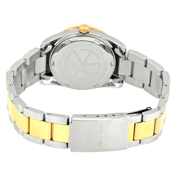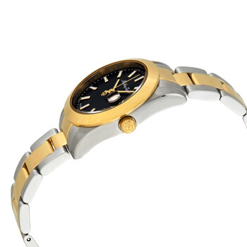 Stainless steel case with a two-tone (silver-tone and yellow gold-plated) stainless steel bracelet. Fixed yellow gold-plated bezel. Black dial with luminous yellow gold-tone hands and index hour markers. Minute markers around the outer rim. Dial Type: Analog. Date display at the 3 o'clock position. Ronda caliber 585 quartz movement. Scratch resistant mineral crystal. Pull / push crown. Solid case back. Round case shape. Case size: 30 mm. Case thickness: 11 mm. Band width: 18 mm. Fold over clasp with a safety release. Water resistant at 50 meters / 165 feet. Functions: date, hour, minute, second. Casual watch style. Watch label: Swiss Movt. Mathey-Tissot Mathey I Quartz Black Dial Ladies Watch D450BN.