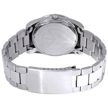 Stainless steel case with a stainless steel bracelet. Fixed stainless steel bezel. Black dial with luminous silver-tone hands and index hour markers. Minute markers around the outer rim. Dial Type: Analog. Luminescent hands and markers. Date display at the 3 o'clock position. Ronda caliber 505 quartz movement. Scratch resistant mineral crystal. Pull / push crown. Solid case back. Round case shape. Case size: 40 mm. Case thickness: 11 mm. Band width: 20 mm. Fold over clasp. Water resistant at 50 meters / 165 feet. Functions: date, hour, minute, second. Casual watch style. Watch label: Swiss Movt. Mathey-Tissot Mathey I Quartz Black Dial Men's Watch H450AN.