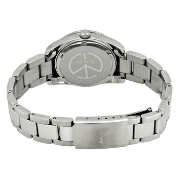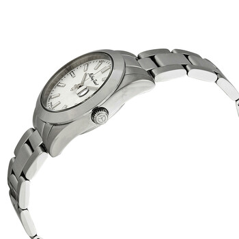 Stainless steel case with a stainless steel bracelet. Fixed stainless steel bezel. White dial with luminous silver-tone hands and index hour markers. Minute markers around the outer rim. Dial Type: Analog. Luminescent hands and markers. Date display at the 3 o'clock position. Ronda caliber 585 quartz movement. Scratch resistant mineral crystal. Pull / push crown. Solid case back. Round case shape. Case size: 30 mm. Case thickness: 11 mm. Band width: 16 mm. Fold over clasp with a safety release. Water resistant at 50 meters / 165 feet. Functions: date, hour, minute, second. Casual watch style. Watch label: Swiss Movt. Mathey-Tissot Mathey I Quartz White Dial Ladies Watch D450AI.