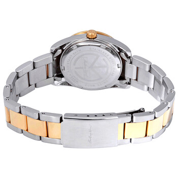 Silver-tone stainless steel case with a two-tone (silver-tone and yellow gold-plated) stainless steel bracelet. Fixed yellow gold-plated bezel. White dial with luminous yellow gold-tone hands and index hour markers. Arabic numeral minute markers (at 5 minute intervals). Minute markers around the outer rim. Dial Type: Analog. Luminescent hands and markers. Date display at the 3 o'clock position. Ronda Caliber 585 quartz movement. Scratch resistant mineral crystal. Pull / push crown. Solid case back. Round case shape. Case size: 30 mm. Case thickness: 11 mm. Band width: 16 mm. Fold over clasp with a safety release. Water resistant at 50 meters / 165 feet. Functions: date, hour, minute, second. Mathey I Series. Casual watch style. Watch label: Swiss Movt. Mathey-Tissot Mathey I Quartz White Dial Ladies Watch D450BI.
