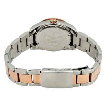Stainless steel case with a two-tone (silver-tone and rose gold-plated) stainless steel bracelet. Fixed rose gold-plated bezel. White dial with rose gold-tone hands and index hour markers. Minute markers around the outer rim. Dial Type: Analog. Luminescent hands and markers. Date display at the 3 o'clock position. Ronda caliber 585 quartz movement. Scratch resistant mineral crystal. Pull / push crown. Solid case back. Round case shape. Case size: 30 mm. Case thickness: 11 mm. Fold over clasp. Water resistant at 50 meters / 165 feet. Functions: date, hour, minute, second. Casual watch style. Watch label: Swiss Movt. Mathey-Tissot Mathey I Quartz White Dial Ladies Watch D450RA.