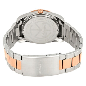 Stainless steel case with a two-tone (silver-tone and rose gold-plated) stainless steel bracelet. Fixed rose gold-plated bezel. White dial with luminous rose gold-tone hands and index hour markers. Minute markers around the outer rim. Dial Type: Analog. Luminescent hands and markers. Date display at the 3 o'clock position. Ronda caliber 505 quartz movement. Scratch resistant mineral crystal. Pull / push crown. Solid case back. Round case shape. Case size: 40 mm. Case thickness: 11 mm. Band width: 22 mm. Fold over clasp with a safety release. Water resistant at 50 meters / 165 feet. Functions: date, hour, minute, second. Mathey I Series. Casual watch style. Watch label: Swiss Movt. Mathey-Tissot Mathey I Quartz White Dial Men's Watch H450RA.