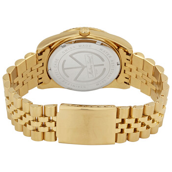 Yellow gold-plated stainless steel case and bracelet. Fixed yellow gold-plated bezel. Mother of pearl dial with yellow gold-tone hands and crystal hour markers. Minute markers around the outer rim. Dial Type: Analog. Luminescent hands and markers. Date display at the 3 o'clock position. Ronda Caliber 515 quartz movement. Scratch resistant mineral crystal. Pull / push crown. Solid case back. Round case shape. Case size: 40 mm. Case thickness: 5 mm. Band width: 20 mm. Fold over clasp. Water resistant at 30 meters / 100 feet. Functions: date, hour, minute, second. Dress watch style. Watch label: Swiss Made. Mathey-Tissot Mathey II Quartz Crystal Mother of Pearl Dial Men's Watch H710PI.