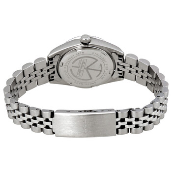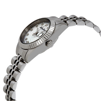 Stainless steel case with a stainless steel bracelet. Fixed stainless steel bezel. White mother of pearl dial with luminous silver-tone hands and crystal hour markers. Minute markers around the outer rim. Dial Type: Analog. Luminescent hands and markers. Date display at the 3 o'clock position. Ronda caliber 585 quartz movement. Scratch resistant mineral crystal. Pull / push crown. Solid case back. Round case shape. Case size: 26 mm. Case thickness: 3 mm. Fold over clasp. Water resistant at 30 meters / 100 feet. Functions: date, hour, minute, second. Mathey II Series. Dress watch style. Watch label: Swiss Made. Mathey-Tissot Mathey II Quartz Crystal White Mother of Pearl Dial Ladies Watch D710AI.