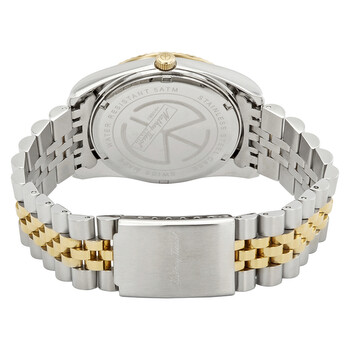 Silver-tone stainless steel case with a two-tone (silver-tone and gold PVD) stainless steel bracelet. Fixed yellow gold PVD stainless steel bezel. Blue dial with luminous yellow gold-tone hands and index hour markers. Minute markers around the outer rim. Dial Type: Analog. Luminescent hands and markers. Date display at the 3 o'clock position. Ronda Caliber 515 quartz movement. Scratch resistant mineral crystal. Pull / push crown. Solid case back. Round case shape, case size: 40 mm, case thickness: 5 mm. Band width: 20 mm. Fold over clasp. Water resistant at 30 meters / 100 feet. Functions: date, hour, minute, second. Casual watch style. Watch label: Swiss Made. Mathey-Tissot Mathey III Quartz Blue Dial Men's Watch H810BBU.