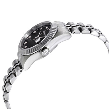 Silver-tone stainless steel case and bracelet. Fixed silver-tone stainless steel bezel. Black dial with silver-tone hands and crystal hour markers. Minute markers around the outer rim. Dial Type: Analog. Luminescent hands and markers. Date display at the 3 o'clock position. Ronda Caliber 585 quartz movement. Scratch resistant mineral crystal. Pull / push crown. Solid case back. Round case shape, case size: 32 mm, case thickness: 3 mm. Band width: 12 mm. Fold over clasp. Water resistant at 30 meters / 100 feet. Functions: date, hour, minute, second. Mathey IIi Series. Casual watch style. Watch label: Swiss Made. Mathey-Tissot Mathey III Quartz Crystal Black Dial Ladies Watch D810AN.