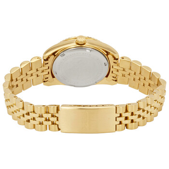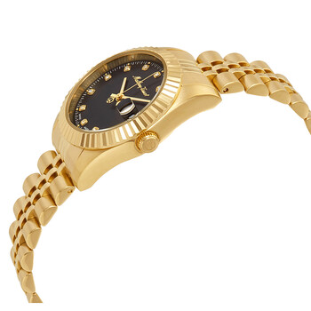 Yellow gold PVD stainless steel case and bracelet. Fixed yellow gold PVD stainless steel bezel. Black dial with luminous yellow gold-tone hands and crystal hour markers. Minute markers around the outer rim. Dial Type: Analog. Date display at the 3 o'clock position. Quartz movement. Scratch resistant mineral crystal. Pull / push crown. Solid case back. Round case shape, case size: 32 mm, case thickness: 3 mm. Band width: 12 mm. Fold over clasp. Water resistant at 30 meters / 100 feet. Functions: date, hour, minute, second. Mathey IIi Series. Dress watch style. Watch label: Swiss Made. Mathey-Tissot Mathey III Quartz Crystal Black Dial Ladies Watch D810PN.
