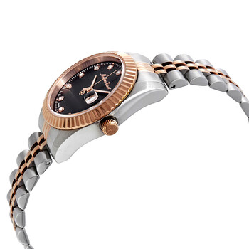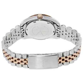 Silver-tone stainless steel case with a two-tone (silver-tone and rose gold PVD) stainless steel bracelet. Fixed rose gold PVD stainless steel bezel. Black dial with luminous rose gold-tone hands and crystal hour markers. Minute markers around the outer rim. Dial Type: Analog. Luminescent hands and markers. Date display at the 3 o'clock position. Ronda Caliber 585 quartz movement. Scratch resistant mineral crystal. Pull / push crown. Solid case back. Round case shape, case size: 32 mm, case thickness: 3 mm. Fold over clasp. Water resistant at 30 meters / 100 feet. Functions: date, hour, minute, second. Mathey IIi Series. Dress watch style. Watch label: Swiss Made. Mathey-Tissot Mathey III Quartz Crystal Black Dial Ladies Watch D810RN.