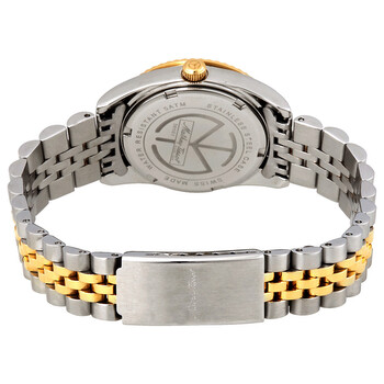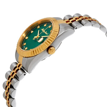 Silver-tone stainless steel case with a two-tone (silver-tone and yellow gold PVD) stainless steel bracelet. Fixed yellow gold PVD stainless steel bezel. Green dial with luminous yellow gold-tone hands and crystal hour markers. Minute markers around the outer rim. Dial Type: Analog. Luminescent hands and markers. Date display at the 3 o'clock position. Ronda Caliber 585 quartz movement. Scratch resistant mineral crystal. Pull / push crown. Solid case back. Round case shape, case size: 32 mm, case thickness: 3 mm. Fold over clasp. Water resistant at 30 meters / 100 feet. Functions: date, hour, minute, second. Mathey IIi Series. Dress watch style. Watch label: Swiss Made. Mathey-Tissot Mathey III Quartz Crystal Green Dial Ladies Watch D810BV.