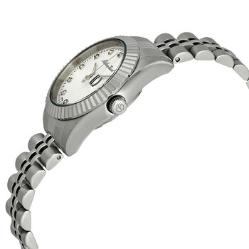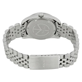 Silver-tone stainless steel case and bracelet. Fixed silver-tone stainless steel bezel. Silver dial with luminous silver-tone hands and crystal hour markers. Minute markers around the outer rim. Dial Type: Analog. Luminescent hands and markers. Date display at the 3 o'clock position. Ronda Caliber 515 quartz movement. Scratch resistant mineral crystal. Pull / push crown. Solid case back. Round case shape, case size: 32 mm, case thickness: 3 mm. Band width: 16 mm. Fold over clasp. Water resistant at 30 meters / 100 feet. Functions: date, hour, minute, second. Mathey IIi Series. Dress watch style. Watch label: Swiss Made. Mathey-Tissot Mathey III Quartz Crystal Silver Dial Ladies Watch D810AI.