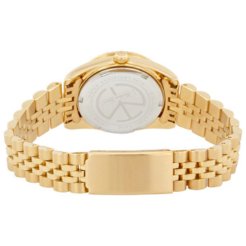 Yellow gold-tone stainless steel case with a yellow gold PVD stainless steel bracelet. Fixed yellow gold PVD stainless steel bezel. White dial with luminous yellow gold-tone hands and crystal hour markers. Minute markers around the outer rim. Dial Type: Analog. Luminescent hands. Date display at the 3 o'clock position. Ronda Caliber 585 quartz movement. Scratch resistant mineral crystal. Pull / push crown. Solid case back. Round case shape, case size: 32 mm, case thickness: 3 mm. Fold over clasp. Water resistant at 50 meters / 165 feet. Functions: date, hour, minute, second. Mathey IIi Series. Dress watch style. Watch label: Swiss Movt. Mathey-Tissot Mathey III Quartz Crystal White Dial Ladies Watch D810PI.