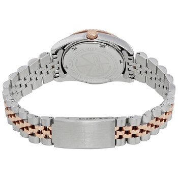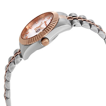 Silver-tone stainless steel case with a two-tone (silver-tone and rose gold PVD) stainless steel bracelet. Fixed rose gold PVD stainless steel bezel. White dial with rose gold-tone hands and crystal hour markers. Minute markers around the outer rim. Dial Type: Analog. Luminescent hands and markers. Date display at the 3 o'clock position. Ronda Caliber 585 quartz movement. Scratch resistant mineral crystal. Pull / push crown. Solid case back. Round case shape, case size: 32 mm, case thickness: 3 mm. Band width: 16 mm. Fold over clasp. Water resistant at 30 meters / 100 feet. Functions: date, hour, minute, second. Mathey IIi Series. Dress watch style. Watch label: Swiss Made. Mathey-Tissot Mathey III Quartz Crystal White Dial Ladies Watch D810RA.