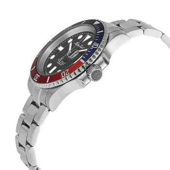 Stainless steel case with a stainless steel bracelet. Uni-directional rotating stainless steel bezel with an inlaid blue and red ring. Black dial with luminous silver-tone hands and dot hour markers. Minute markers around the outer rim. Dial Type: Analog. Luminescent hands and markers. Date display at the 3 o'clock position. Ronda caliber 515 quartz movement. Scratch resistant sapphire crystal. Screw down crown. Solid case back. Round case shape. Case size: 43.5 mm. Case thickness: 8.55 mm. Band width: 20 mm. Deployment clasp. Water resistant at 100 meters / 330 feet. Functions: date, hour, minute, second. Mathey Jumbo Series. Casual watch style. Watch label: Swiss Movt. Mathey-Tissot Mathey Jumbo Quartz Black Dial Men's Watch H906AR.