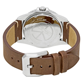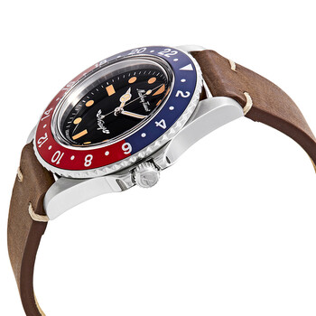Stainless steel case with a brown leather strap. Uni-directional rotating stainless steel bezel with a blue and red (Pepsi) ring. Black dial with luminous gold-tone hands and dot hour markers. Minute markers around the outer rim. Dial Type: Analog. Luminescent hands and markers. Date display at the 3 o'clock position. Ronda caliber 505 quartz movement. Scratch resistant mineral crystal. Screw down crown. Solid case back. Round case shape. Case size: 40 mm. Case thickness: 10 mm. Band width: 20 mm. Tang clasp. Water resistant at 50 meters / 165 feet. Functions: date, hour, minute, second. Sport watch style. Watch label: Swiss Made. Mathey-Tissot Mathey Vintage Black Dial Pepsi Bezel Black Dial Men's Watch H900ALR.